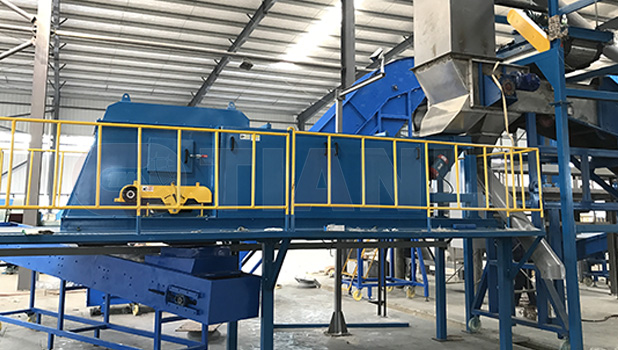 The crushing material of the refrigerator contains impurities such as iron and aluminum. Through the uniform feeding of the gzd-1300 x 4900 vibrating feeder, the material is fed into the RCT1200 magnetic drum. First, the material is removed from iron, then the material is sorted into the concentric eddy current host tlfx-1300 and the remaining materials are treated as non-metallic materials.